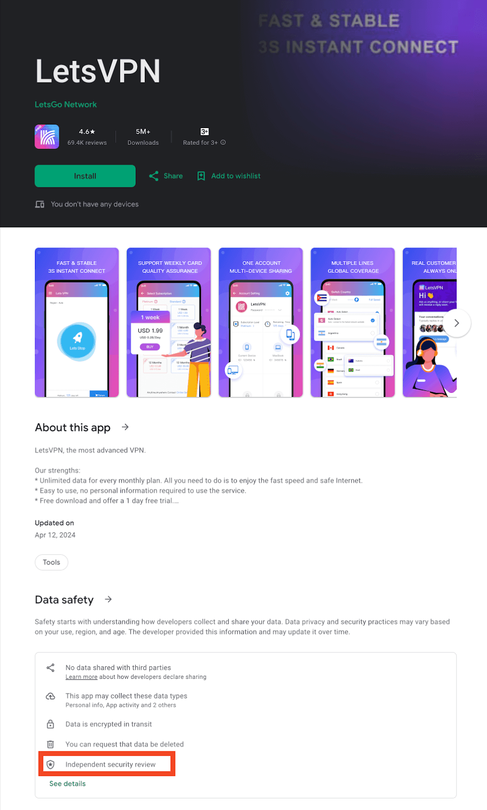 Google prominently displays the Independent Security Review Badge on the homepage of the app store, helping Android users easily identify secure and reliable VPN applications. This breaks away from the traditional filtering methods based on download rankings and user reviews, preventing the risk of downloading unsafe applications due to fake download numbers and manipulated reviews.